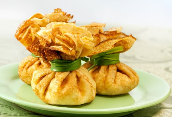 Испечь блины. Филе семги нарезать кубиками, лук — кольцами. Лук и рыбу жарить5 мин, добавить сметану, влить молоко, тушить до загустения. Посолить, поперчить, добавить измельченную зелень укропа. Выложить порцию на блин, посыпать тертым сыром, сложить мешочком, обвязать зеленым луком, смазать маслом, запекать в духовке 10—15 мин.