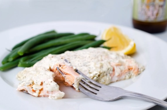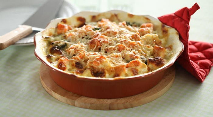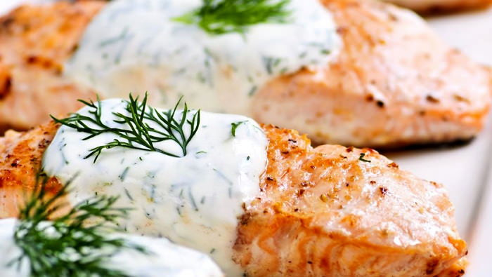 филе семги и залить все полученным соусом. Запеканку поместить в предварительно разогретую духовку и довести до готовности. Перед подачей на стол посыпать рубленым укропом.