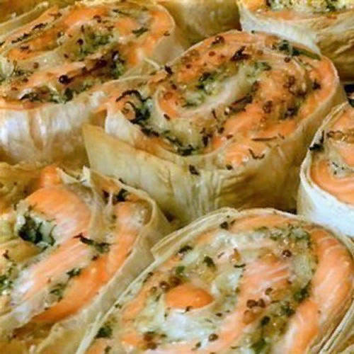 Запекать рулеты из лаваша с семгой примерно 20 минут при температуре 190 градусов. Рулеты из лаваша с семгой готовы.
