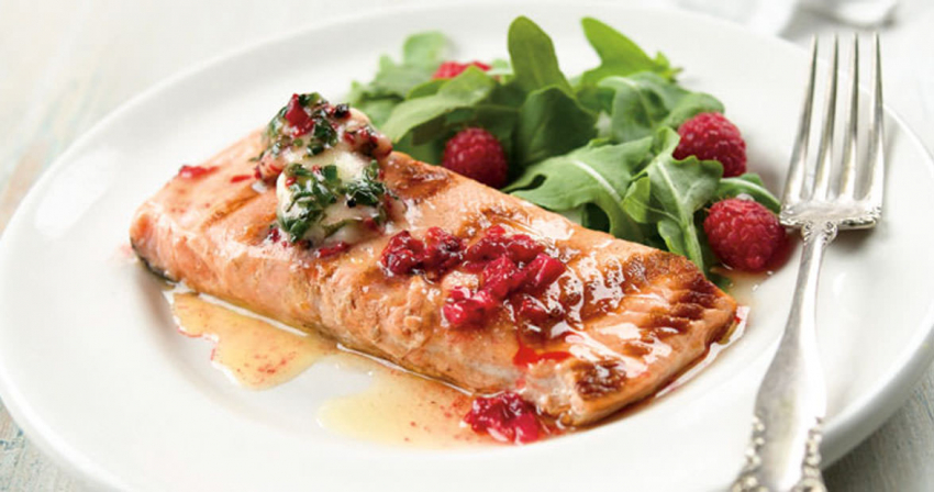 - Готовую рыбу выложить на тарелку, сверху выложить рукколу и малину. Полить оставшимся соусом.