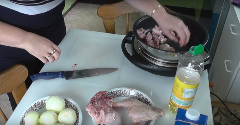 - Нарежь куриные окорочка на небольшие кусочки и поджарь мясо на сковороде до образования румяной корочки.