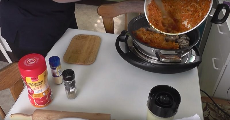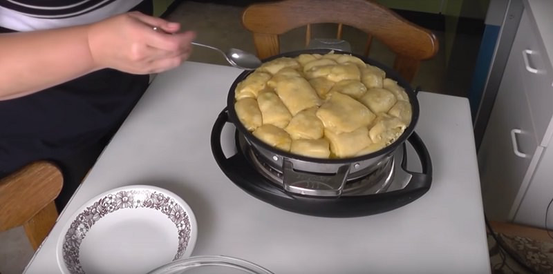 - Выложи маленькие рулетики в сковороду поверх мяса с овощами. Готовь бешбармак еще 30 минут на медленном огне.