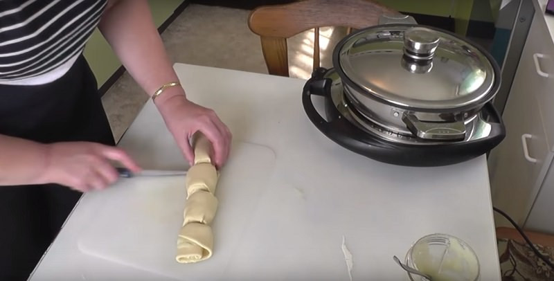 - Сверни каждый круг рулетом и разрежь на несколько одинаковых частей.