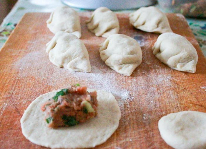 - На каждый кружок положите 1 ч. ложку начинки и залепите края. Для этого приподнимите два противоположных края над начинкой. Один край останется ровным, а на него в виде складочек прижимайте пальцами другой край, как показано на фото. Прижимайте складочки плотнее, чтобы пельмени при готовке не расклеились.