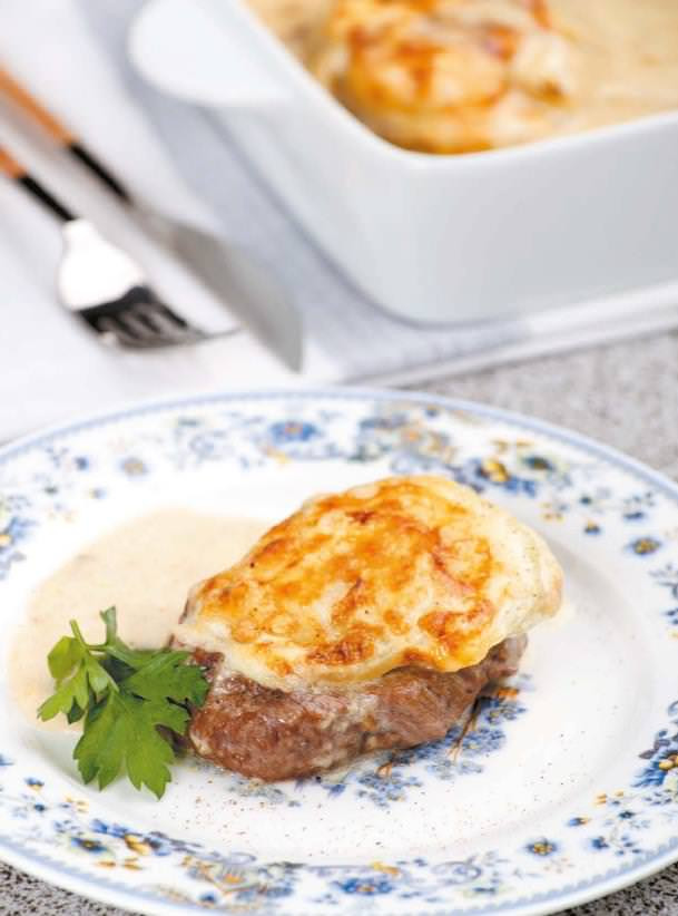 Нарезать вырезку поперек волокон на шайбы толщиной 1 см (кусочки около 60 г). Посолить, поперчить. Обжаривать в оливковом масле с обеих сторон до золотистой корочки. Переложить говядину в огнеупорную форму в один слой. Можно выложить на дно предварительно смазанной маслом формы картофель кружочками — дополнительный гарнир к мяску. Приготовить соус бешамель. В сковороде, где ранее обжаривали вырезку, распустить сливочное масло, добавить муку, обжаривать до золотистого цвета. Добавить небольшими порциями до 400 мл бульона. Тщательно перемешать, чтобы вся мука разошлась и не было комочков. Уварить наполовину. Добавить сливки, уварить еще наполовину, до густоты жирной сметаны, постоянно помешивая. Нарезать очищенный лук кольцами. При желании его можно обжарить на сковороде до прозрачности.