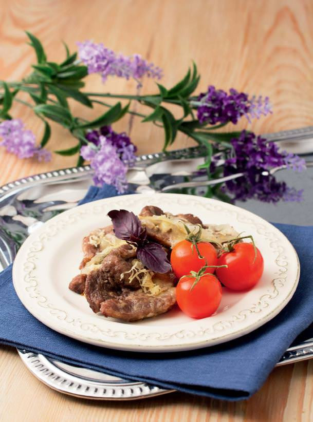 Нарезать свинину поперек волокон порционными кусочками приблизительно по 50 г. Хорошо отбить молотком. Сложить мясо в глубокую емкость. Посолить – поперчить. Влить вино. Добавить листья свежего розмарина. Натереть маленькую луковицу на мелкой терке. Добавить кашицу к мясу. Мариновать 30 мин.