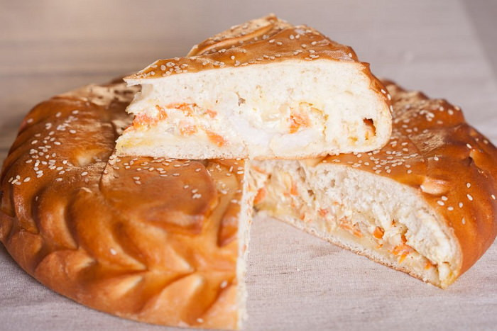 Соедините и перемешайте компоненты. Яйцо соедините с размягченным маслом, сахаром, солью, добавьте муку, замесите тесто, поставьте на час-полтора в холод. Разделите на 2 части, раскатайте прямоугольными пластами. Один пласт положите на дно смазанной оставшимся маслом формы, на него положите начинку, сверху второй пласт. Защипните края, выпекайте около 45 минут при 180 °C.