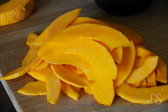 Тем временем, очистить тыкву и нарезать тонкими ломтиками. Выложите ломтики в формочки и сверху залейте кокосовое молоко.