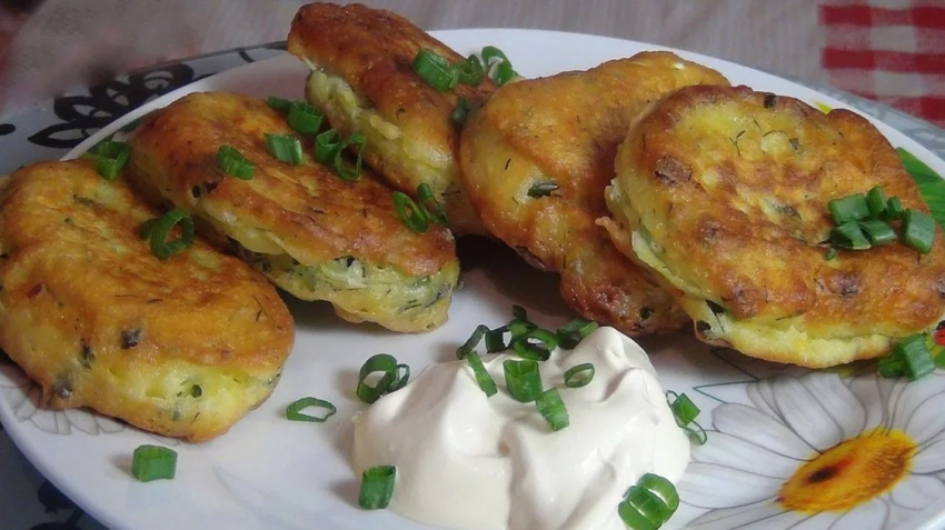- Начинку и тесто тщательно перемешать. Обжаривать на разогретой сковороде с двух сторон до готовности. Подавать со сметаной.