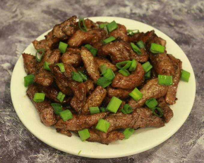 Свинину обжаривают на сковороде, затем добавляют соевый соус, соль, черный перец и все обжаривают до испарения соуса. Затем мясо перекладывают в тарелку, посыпают зеленым луком и подают к столу. В результате получается вкусное и сытное блюдо.