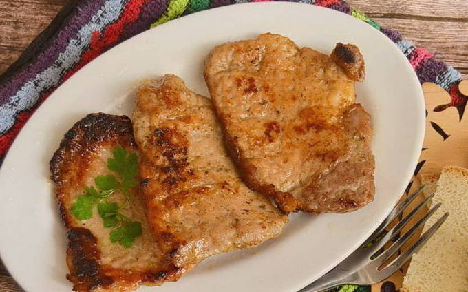 Стейки из свинины отбиваются с двух сторон и присыпаются солью. Затем они выдерживаются в маринаде из масла, меда, горчицы, специй и соевого соуса в течение часа. Затем мясо обжаривается с двух сторон до готовности, перекладывается на тарелку и подается с соусом.Ингредиенты: