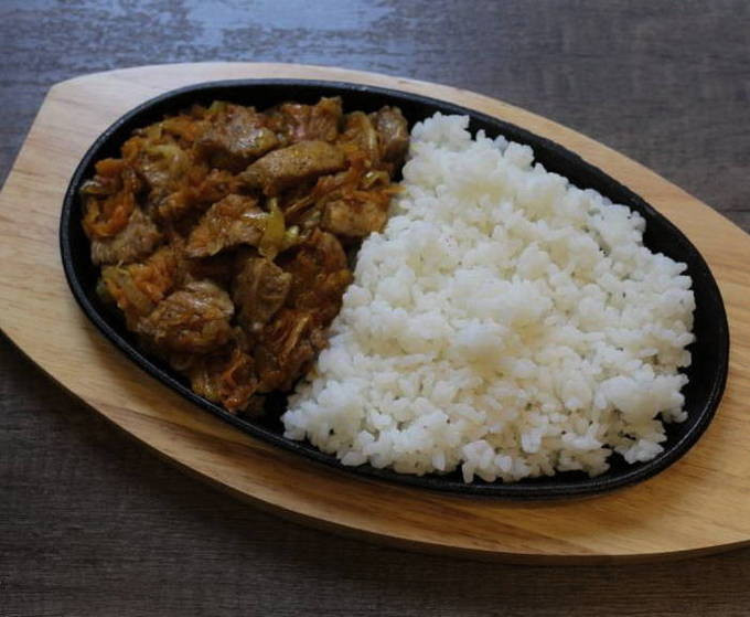Свинина замаринована в соевом соусе, имбире и чесноке. После этого на сковороде обжаривается лук и морковь, затем добавляется вода и все тушится под крышкой 6 минут. Готовое блюдо перекладывают на тарелку и подают с рисом.Ингредиенты: