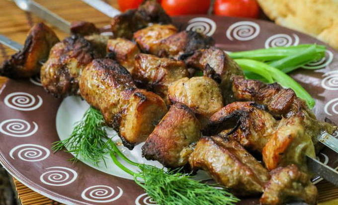 Свинину нарезают крупными кусками и маринуют с луком в соевом соусе, оливковом масле, перце и молотом тмине в течение двух часов. После этого мясо нанизывается на шпажки и готовится на гриле 15-20 минут. Получается очень вкусное и сочное блюдо.Ингредиенты: