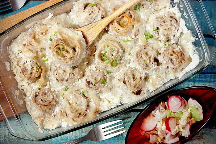 Время, потраченное на готовку, оправдается вкусом этого блюда, тесто и фарш можно всегда приготовить заранее и приготовление блюда окажется намного быстрее. Грузины, ленивые пельмени, рулетики с фаршем и еще много названий такого простого и вкусного блюда.
