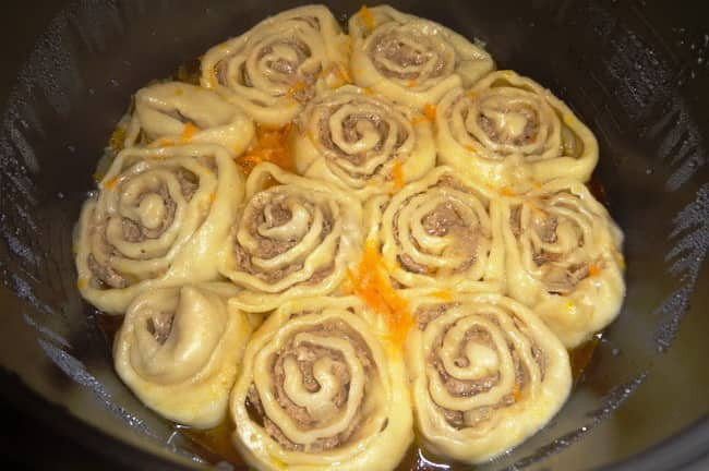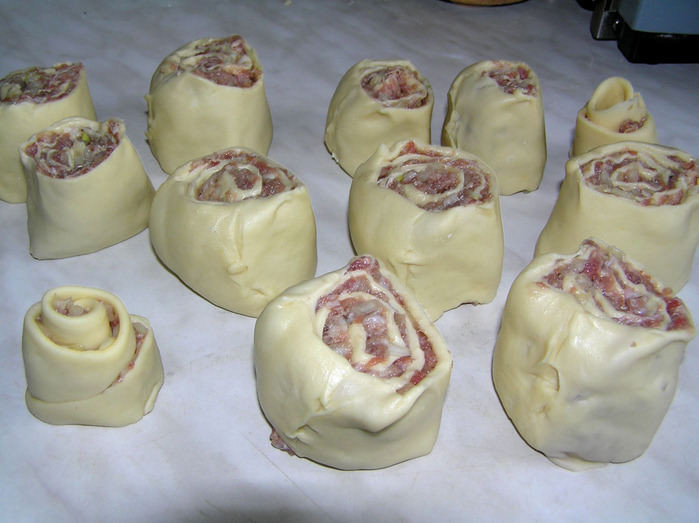 Скатываем тесто с фаршем плотным рулетом, залепляем с открытой стороны. Полученную «колбаску» нарезаем на кусочки шириной 3-4 см. Кусочки укладываем набок – так становятся видны все слои и кусочки похожи на розочки.