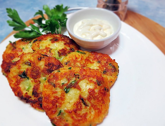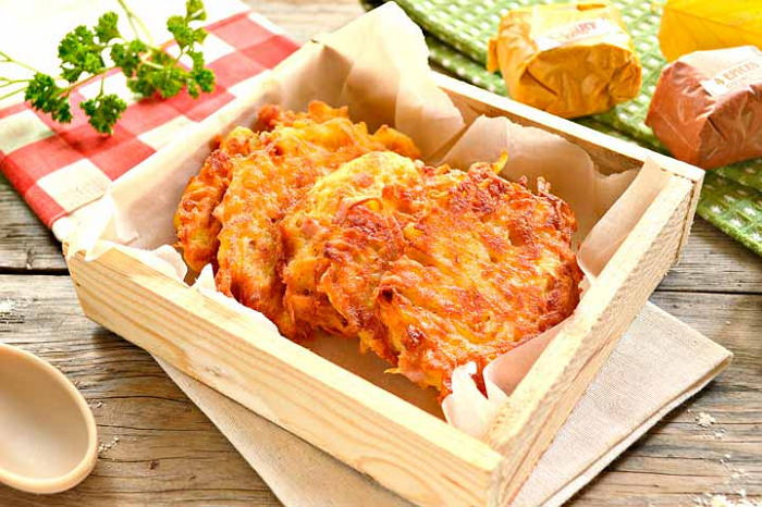 - Поджаренные оладьи выложить на бумажную салфетку, чтобы убрать лишнее масло. Подавать картофельные оладьи с сыром к салату из свежих овощей, сметанным соусом.