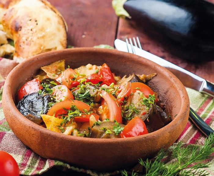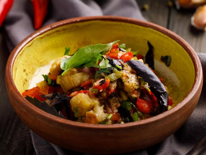 - Запеченные в духовом шкафу баклажаны перекладываются к остальным овощам, все аккуратно перемешивается. Через пять минут в аджапсандал кладется растертая с чесноком и солью кинза, а также измельченные листья базилика. С этого момента овощи тушатся еще около 15 мин.