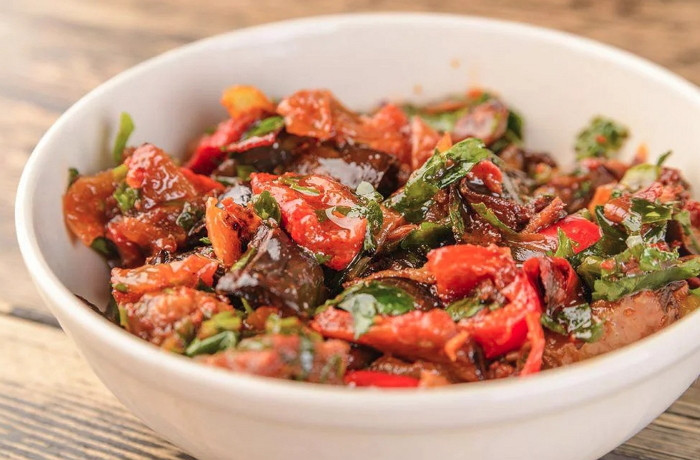 - Грузинское блюдо — овощной аджаб-сандал — готово. Подавать это блюдо лучше в теплом или в холодном виде.
