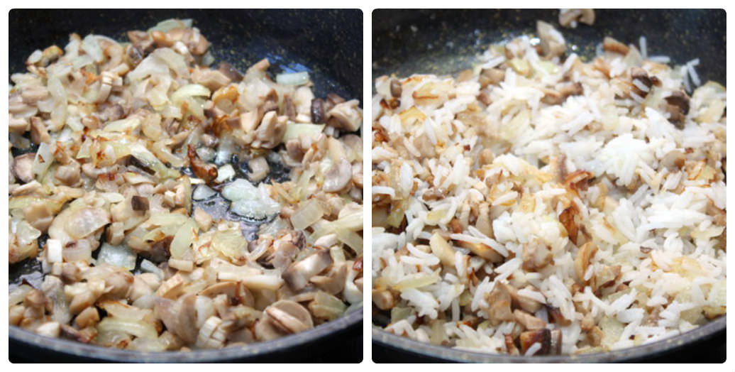 Лук мелко порезать и слегка обжарить в масле. Затем добавить туда нарезанные ножки шампиньонов и продолжать жарить все вместе до выпаривания жидкости. Добавить в сковородку сваренный рис, посолить, поперчить по вкусу, перемешать.