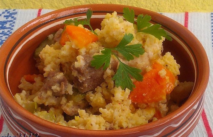 Помыть пшено и засыпать в котелок, как только содержимое вскипит, убавить огонь до самого небольшого. Готовить минут двадцать, в середине размешать крупу с мясом и овощами и потом не трогать. Выключить пламя, лучше, если казан накрыть и дать каше завариться 15-20 минут. И только затем насыпать в тарелки и подавать на стол.