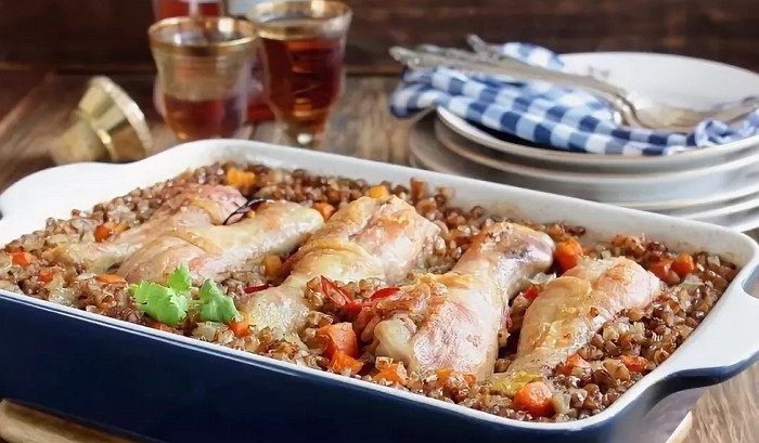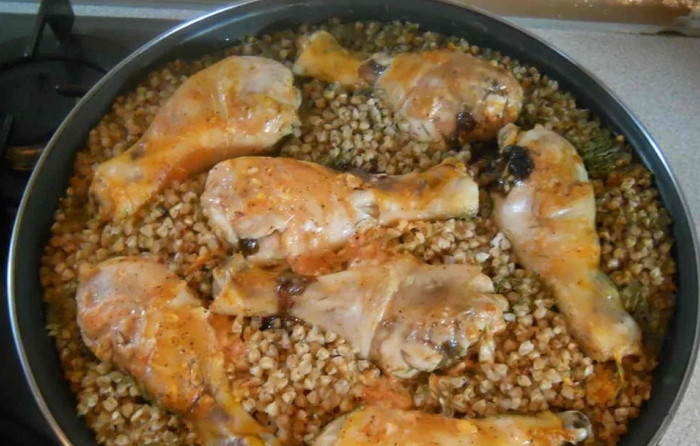 Это простое блюдо можно приготовить в любой будний день на обед или ужин. Гречка с курицей в духовке – это сытно и очень вкусно!