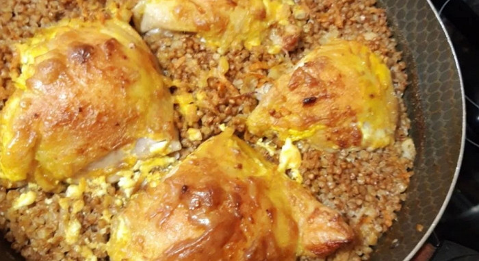 - Перебрать и промыть гречку, обсушить ее. Перемешать гречку и жареный лук, выложить в форму для запекания, выложить сверху кусочки курицы (курицу лучше предварительно замариновать, натерев специями и солью).