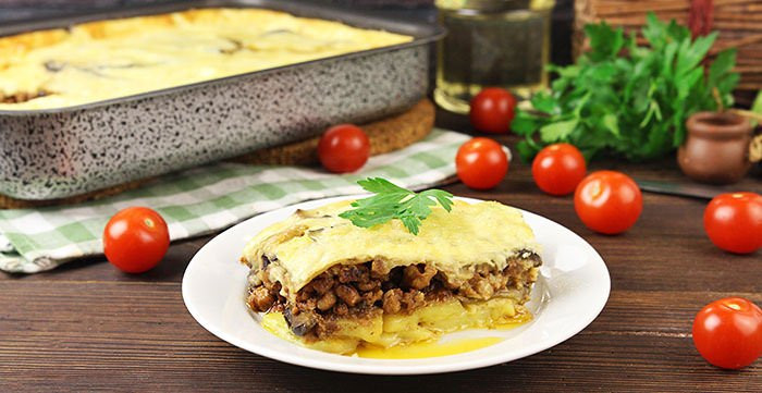 Мусака – яркий представитель традиционной греческой кухни. Это слоеная овощная запеканка с обжаренным мясным фаршем, залитая сливочно-сырным соусом. Из-за своей схожести с известным итальянским шедевром мусаку еще называют «овощной лазаньей».