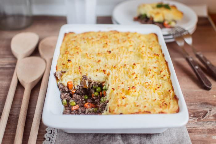 - Разогреть духовку до 200 градусов. Распределить фарш с овощами ровным слоем в большой форме для выпечки. Равномерно выложить пюре поверх фарша. Вы можете сделать на поверхности пюре пики при помощи вилки, которые смогут хорошо подрумяниться в духовке. Запекать около 30 минут.