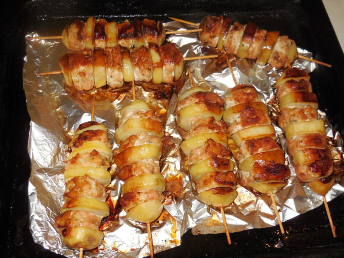 - Первым насаживаем картофель, затем, сформированный шарик фарша. Таким образом чередуем ингредиенты пока до края шпажки не останется два-три сантиметра.