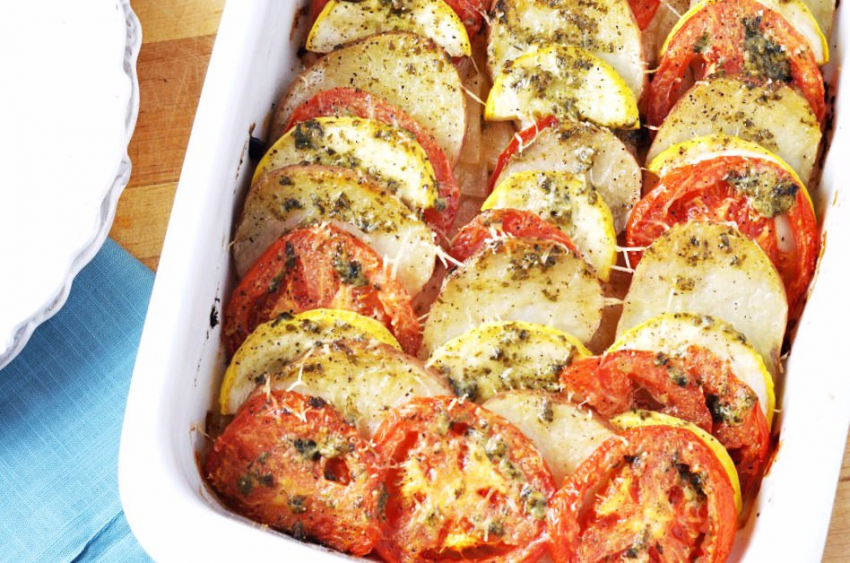 - Вот противень с готовым блюдом сразу после того, как я его вынула из духовки.