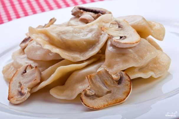На отдельной сковороде на масле обжарить предварительно порезанную соломкой в 1,5 см квашеную капусту. Соединить капусту с грибами, перемешать. При необходимости посолить, поперчить и добавить специи. Дать настояться под крышкой 15 минут. Еще раз перемешать, переложить в миску, чтобы начинка побыстрее остыла. Слепить небольшие по размеру изделия. Отварить готовые изделия в подсоленной воде. Подавать со сливочным маслом или со сметаной.