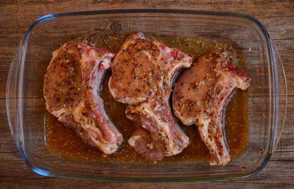 - Вначале промываем под холодной проточной водой корейку и перекладываем ее на разделочную доску. Острым ножом разрезаем мясо между ребрами и снова промываем каждый кусок под холодной проточной водой. После насухо вытираем бумажными кухонными полотенцами и перекладываем в миску или другую емкость.