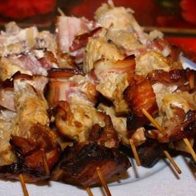 - Мясо нанизать на шпажки, чередуя с беконом (полоску разрезать на две части, каждую половинку свернуть пополам).