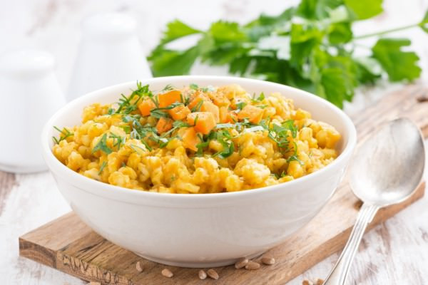 Для приготовления перловой каши с тыквой нужны перловая крупа, тыква, лук, морковка, масло подсолнечное, соль, молотый черный перец. Перловую крупу тщательно промыть, залить произвольным количеством холодной воды и оставить на ночь.