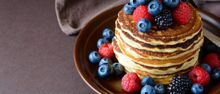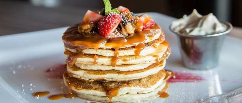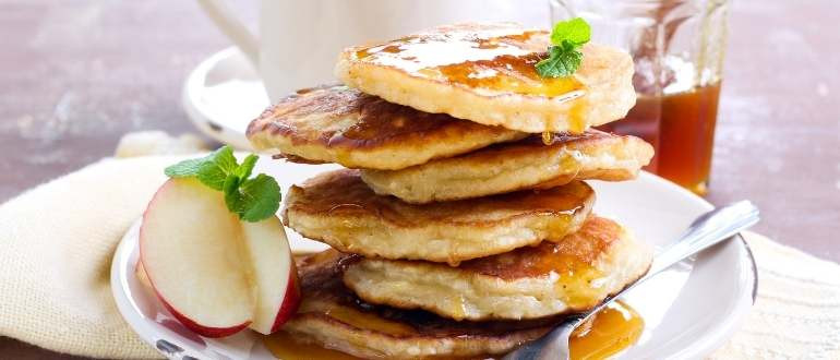 Существует множество различных рецептов приготовления этих коржиков, мы предлагаем приготовить панкейки на кефире, как в классическом варианте, так и с различными добавками. Румяные и аппетитные, их принято подавать к столу с клиновым сиропом. Хотя если заменить его вареньем или сгущенкой, получается тоже очень вкусно!