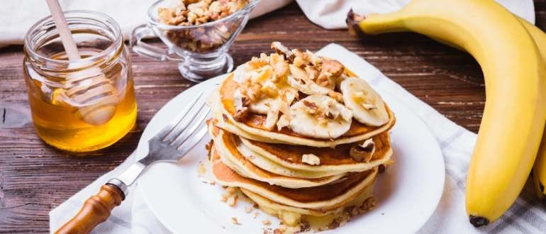 Банановые панкейки на кефире — отличное решение для вкусного и сытного завтрака или полдника. По сути, это обычные панкейки, обогащённые мощными вкусовыми и полезными свойствами этого фрукта. Бананы лучше выбирать перезревшие, в них содержится много сахара и мало крахмала, а также более насыщенный банановый вкус и аромат.Ингредиенты: