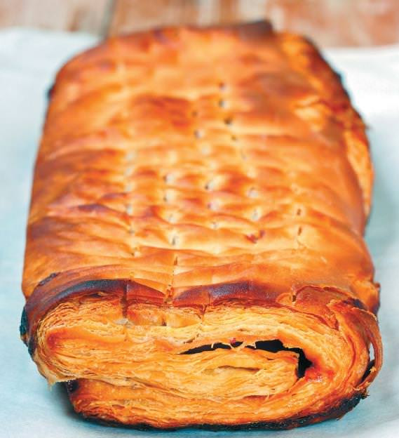 В муку выбить яйцо, добавить масло, соль, замесить тесто, в процессе добавляя понемногу воды (тесто должно получиться не очень сухим и не очень жидким). Из теста скатать колобок, положить в миску, залить растительным маслом (оно должно полностью покрывать тесто). Поместить тесто в холодильник на 30 минут. Вытянуть на пергаменте тесто очень тонко (важно, чтобы оно было очень тонким, почти прозрачным). Равномерно распределить начинку на тесте. Аккуратно поднимая край пергамента, скатать рулет. Выпекать при температуре 180 °С 40 минут.