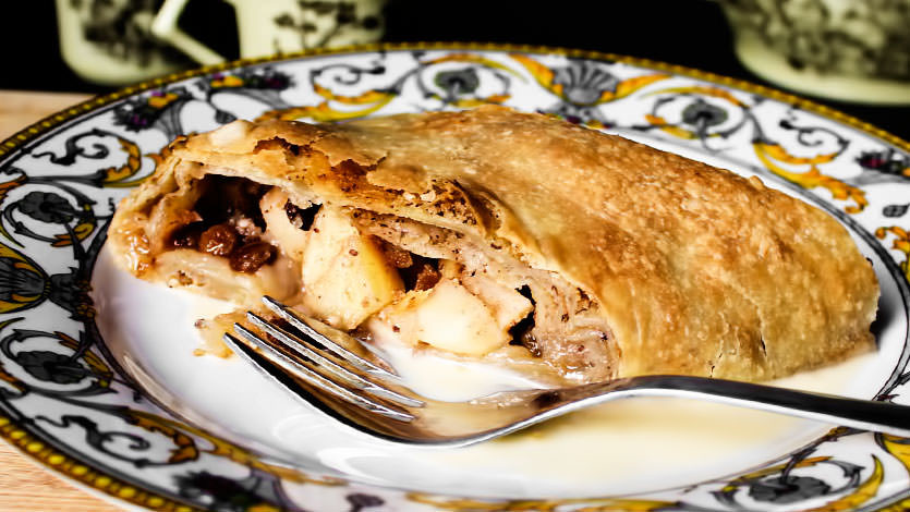 Штрудель с яблоками из слоёного без дрожжевого теста