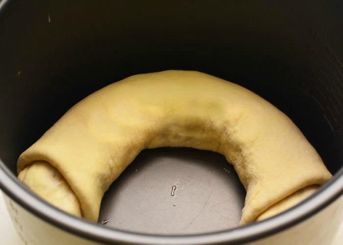 - Мультиварочную кастрюльку смазываем маслом и переносим в неё штрудель. Сгибаем рулет по форме чаши и прижимаем его к стенкам. Запекаем на выпечке в течение 1 часа под закрытой крышкой.