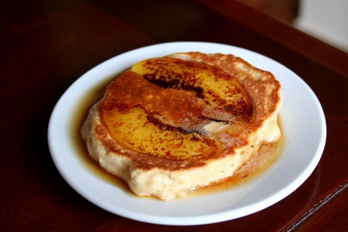 Теперь берем большую сковороду, разогреваем на нем растительное масло. А теперь самое интересное – на сковороду на место будущего оладушка кладем по 3 дольки персика и заливаем тестом. Обжариваем оладьи минуты по 3 с обеих сторон до золотистого цвета. Подаем невероятно вкусные оладьи с персиками на кислом молоке, притрусив их сахарной пудрой.