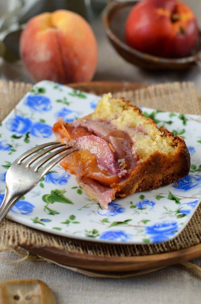 Разогрейте духовку до 180°. В миске взбейте масло, сахар и яйца, пока смесь не побелеет и станет пенистой. Добавить ваниль и йогурт и продолжайте взбивать, затем вмешайте муку и дрожжи, и перемешать, пока тесто не станет однородным. Добавить 1 персик и 1 нектарин, порезать кусочками и аккуратно перемешать.
