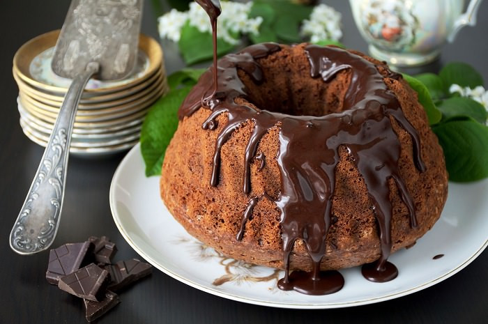Кольцевую форму смазать маслом и присыпать мукой (лишнюю муку стряхнуть). Вылить тесто в форму. Духовку разогреть до 180 градусов, поставить кекс, выпекать 40-60 минут, до момента, когда при проверке, зубочистка будет сухой. Дать кексу немного остыть, перевернуть его на тарелку. Остывший шоколадный кекс можно посыпать сахарной пудрой или полить глазурью.