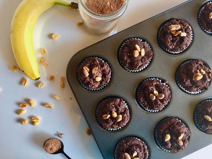 Разогрейте духовку до 180⁰С. Измельчите бананы в пюре, добавьте к ним масло и сахар и хорошо перемешайте. В большую миску просейте муку, какао и соду. Добавьте сухие ингредиенты к жидким и тщательно перемешайте. Если тесто получится слишком густым, добавьте немного растительного молока.
