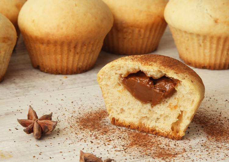 Для каждого кекса тесто делить на две части: первую выложить на дно, дальше положить чайную ложку варенного сгущенного молока и сверху выложить вторую часть теста. Таким образом заполнить форму для кексов. Выпекать при температуре 180–200 градусов до готовности. Около двадцати минут.