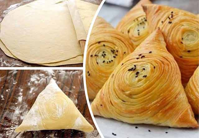 - Основные варианты формовки – круг, квадрат и треугольник. Кстати, удобнее всего делать именно треугольную самсу. Сначала на тесто выкладывают начинку, потом пирог аккуратно заворачивают: его края скрепляют так, чтобы начинка не выпадала.