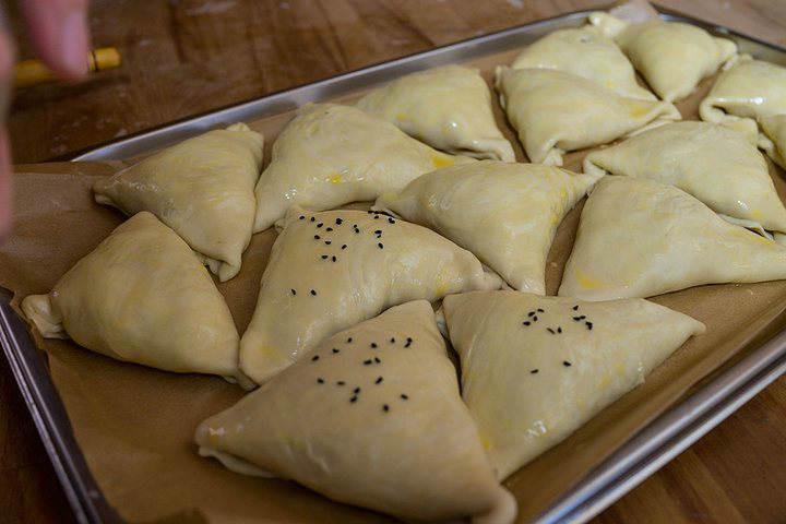 Положите в центр лепешек начинку и защепите края так, чтобы получились треугольные пирожки. Выпекайте в духовке 30 минут при 200 °C. Выключите духовку и дайте самсе «дойти» еще 10 минут, смазав изделия яйцом и посыпав кунжутом.