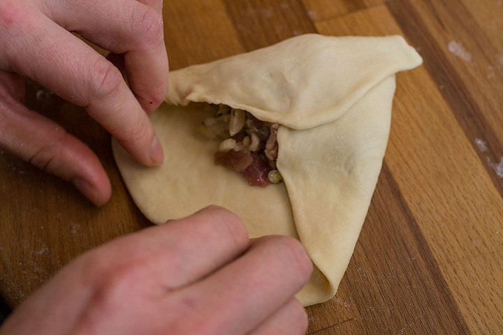 - Для того чтобы не вытек сок из самсы и не вывалилась начинка, края пирога следует тщательно защипать.