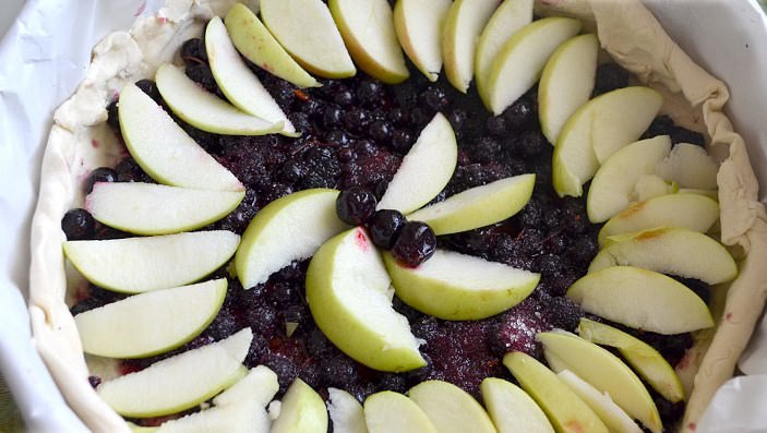 - Выложить на тесто по очередности яблоки и смородину, пересыпая их сахаром.