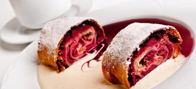 Слоеный пирог можно оформить в виде австрийского штруделя. Тесто понадобится бездрожжевое, сгодится и покупной полуфабрикат. Вкусная сочная начинка превосходно сочетается с хрустящей и рассыпчатой оболочкой. Из полукилограмма теста выйдет небольшой пирог-рулет, которого хватит на шестерых.