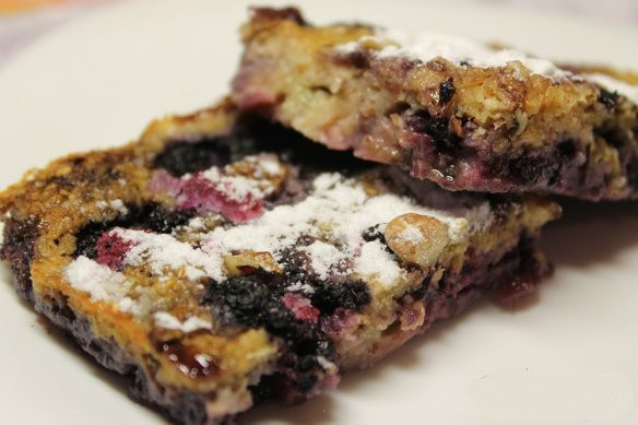Взбить в чашке яйца с солью и сахаром (150 г.). Добавить туда же молоко и сметану. Муку перемешать с отрубями и разрыхлителем. Добавлять частями муку в яичную массу и постоянно помешивать. Форму для выпечки смазать маслом (например, сливочным) и вылить туда тесто. Ягоды промыть, слить лишний сок и добавить в тесто. Их можно как размешать в тесте, так и оставить его на поверхности. Сверху обсыпать оставшимся сахаром. При выпечке он превратится в карамельный слой. Поставить в разогретую до 170 градусов духовку на 25-35 минут.